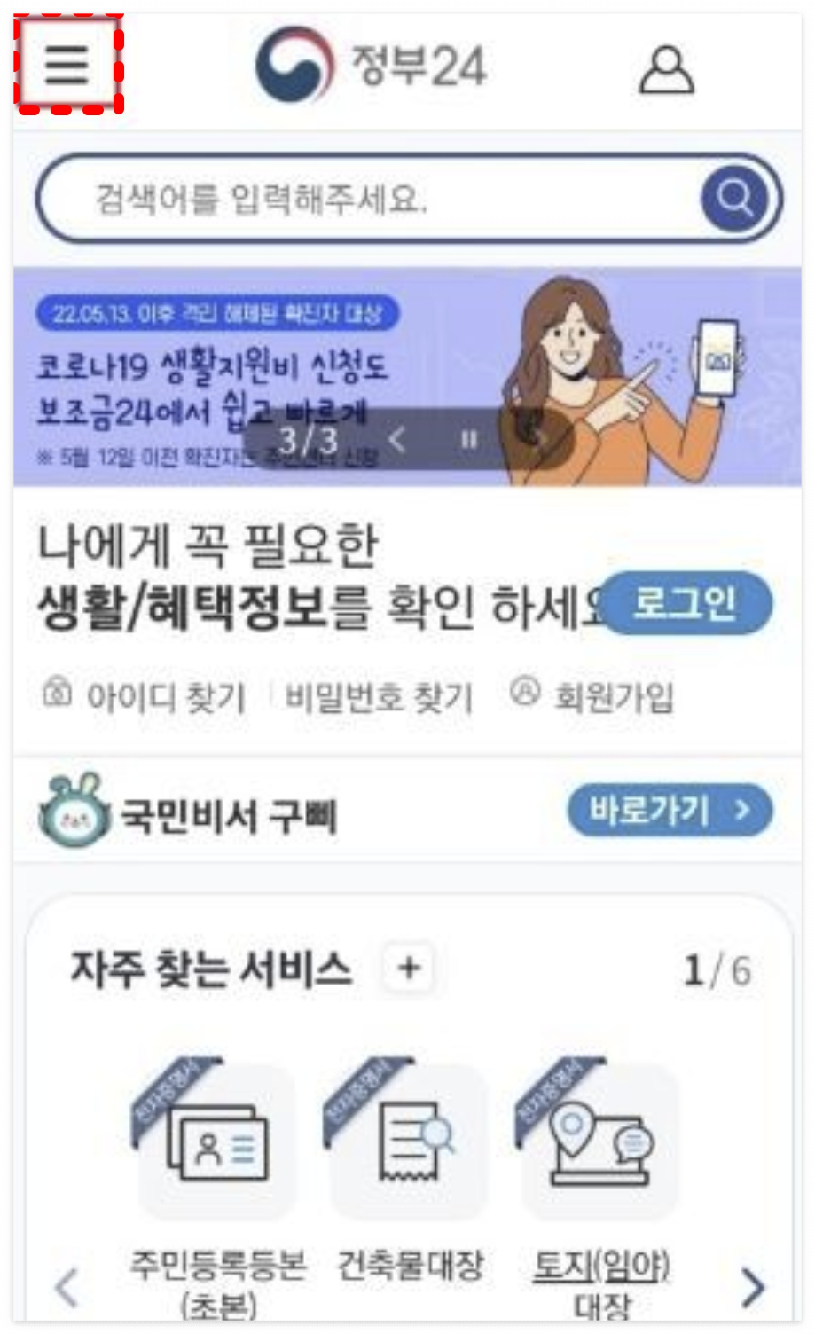 3. 아래와 같은 화면에서 상단에 네모박스로 되어있는 줄 3개가 있는 곳을 클릭하면 나오는 다음화면에서 전자문서지갑을 클릭하시고 로그인하시고 약관에 동의하시면 전자문서지갑을 받으실 수 있습니다.