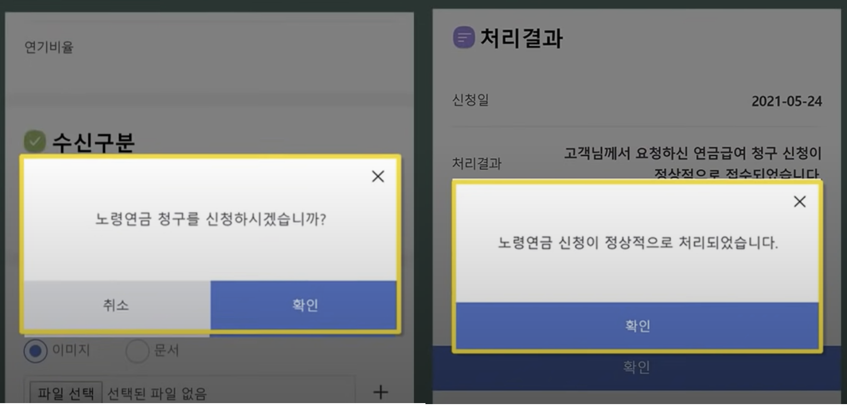 ooo 님은 노령연금 또는 조기노령연금 대상자 입니다. 라는 팝업이 나오면 확인을 누르면 됩니다.