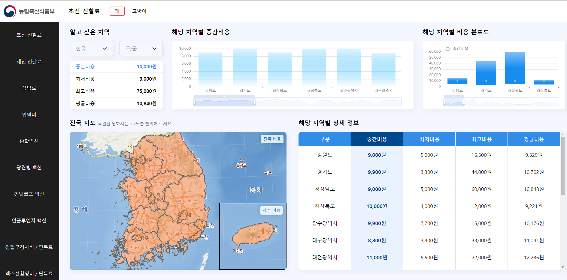농림식품부 누리집(www.mafra.go.kr) → 맞춤정책정보 →소비자 →동물병원진료비 에서 확인 가능합니다.