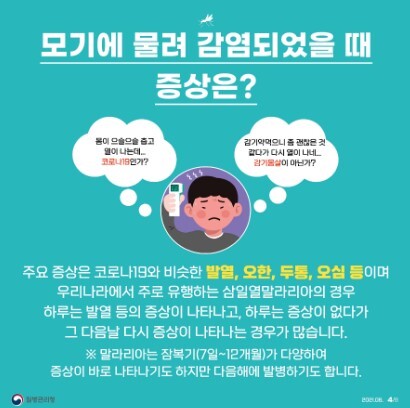 말라리아는 합병증을 동반하기도 해서 초기진단이 매우 중요하기에, 의심증상이 나타나면 보건소나 가까운 의료기관에서 검사를 받아야 합니다.