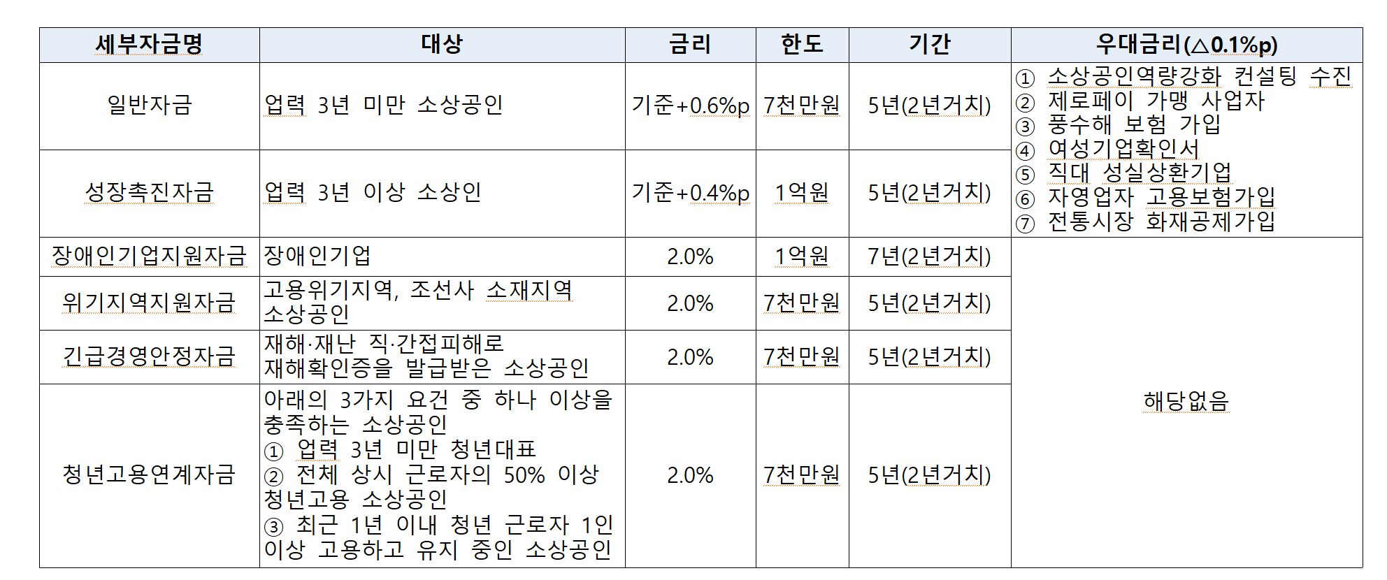 ✅자금명: 소공인특화자금, 성장촉진자금, 스마트자금, 신사업창업사관학교연계자금
