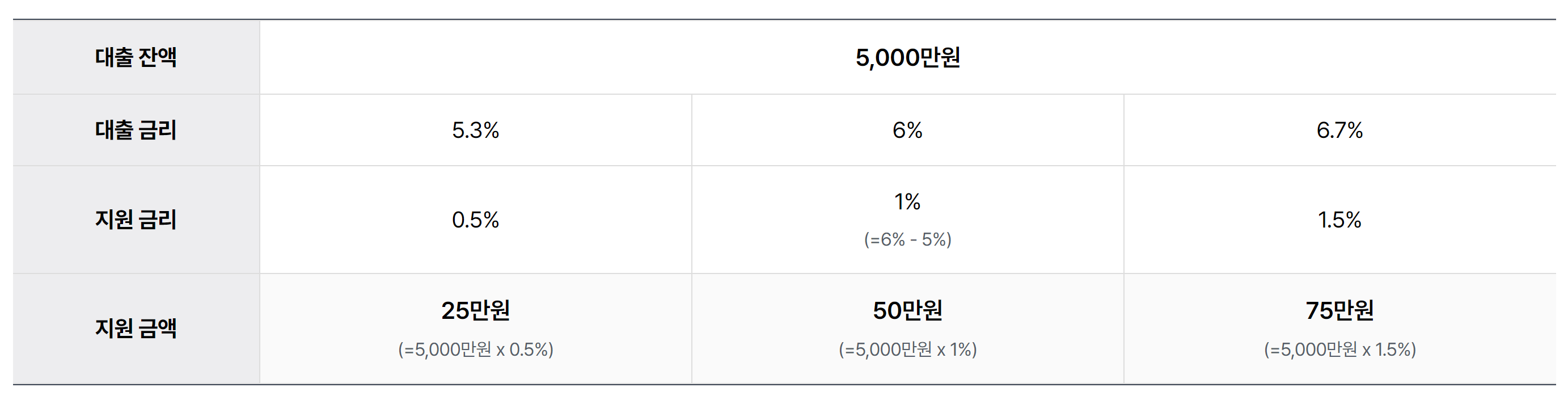 지원금액= 대출잔액 x 해당 대출금리구간 지원 이자율
