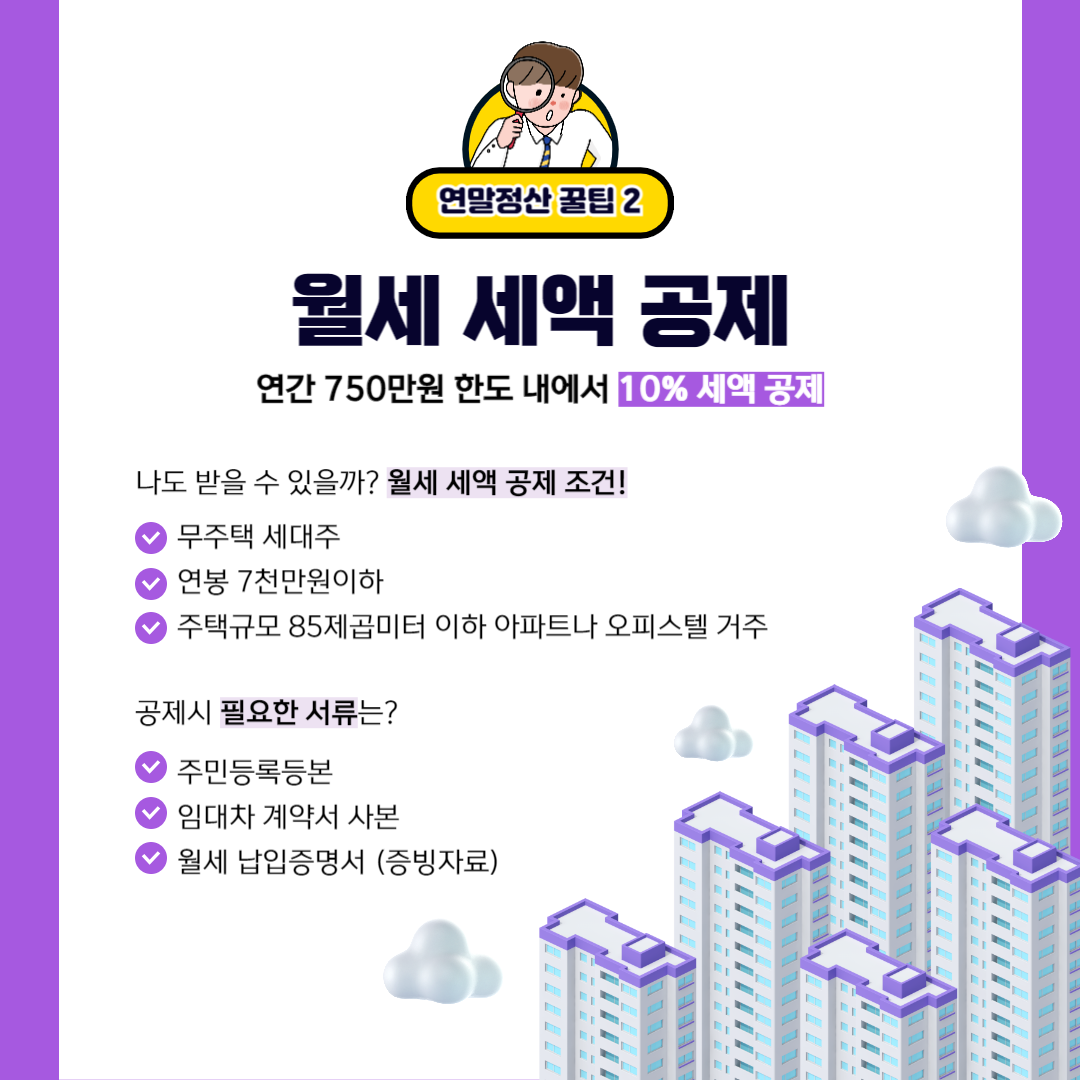 월세 세액공제는 1년동안 지불한 월세에 대해 세금을 공제해 주는 방법입니다.연말정산시 가능합니다. 소득공제보다 세액공제가 실질적으로 금액부분에서도 더 이득입니다.