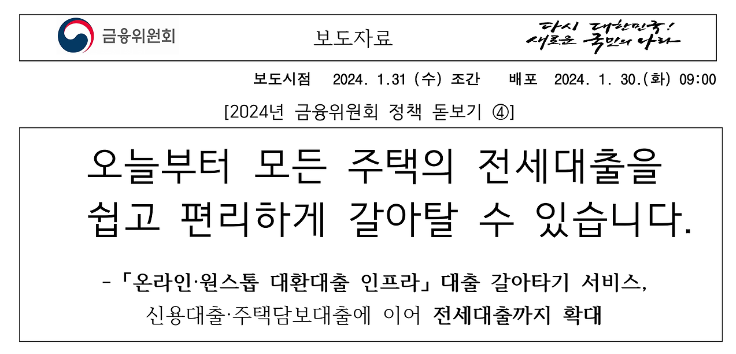 1월 31일부터 아파트, 다세대, 연립주택등 모든 주택의 전세자금 대출의 대환서비스를 비대면으로 온라인 신청 가능합니다. 치솟아 오르는 고금리 때문에 힘들었다면 14개 금융회사 상품으로 비교하여 갈아타기 신청으로 부담스러운 이자금액에서 숨통 좀 트이게 생겼습니다.