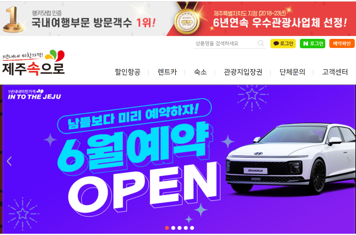 렌터카뿐만 아니라 제주 속으로 홈페이지에 접속하면 제주여행에 필요한 예약서비스를 항공권부터 관광지 입장권까지 예약 가능 합니다.특히 단체관광을 예약 하시고 싶으시다면 제주속으로 사이트를 이용하시면 편하실것 같습니다.