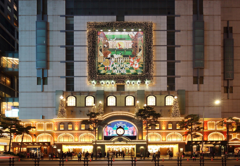 롯데백화점은 15m 높이의 자이언트 트리 점등과 유럽크리스마스 분위기를 연출하며 MY Dearest wish 를주제로 동화적 분위기를 계승하면서 이야기는 보강했다고 합니다.